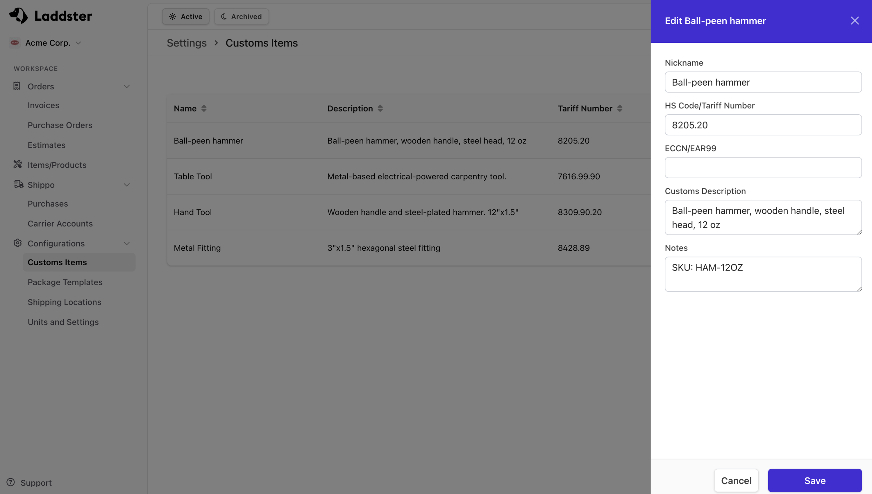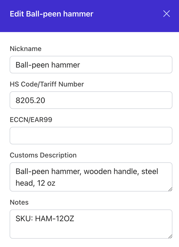 Internal name for the customs item (not shown on declarations). |