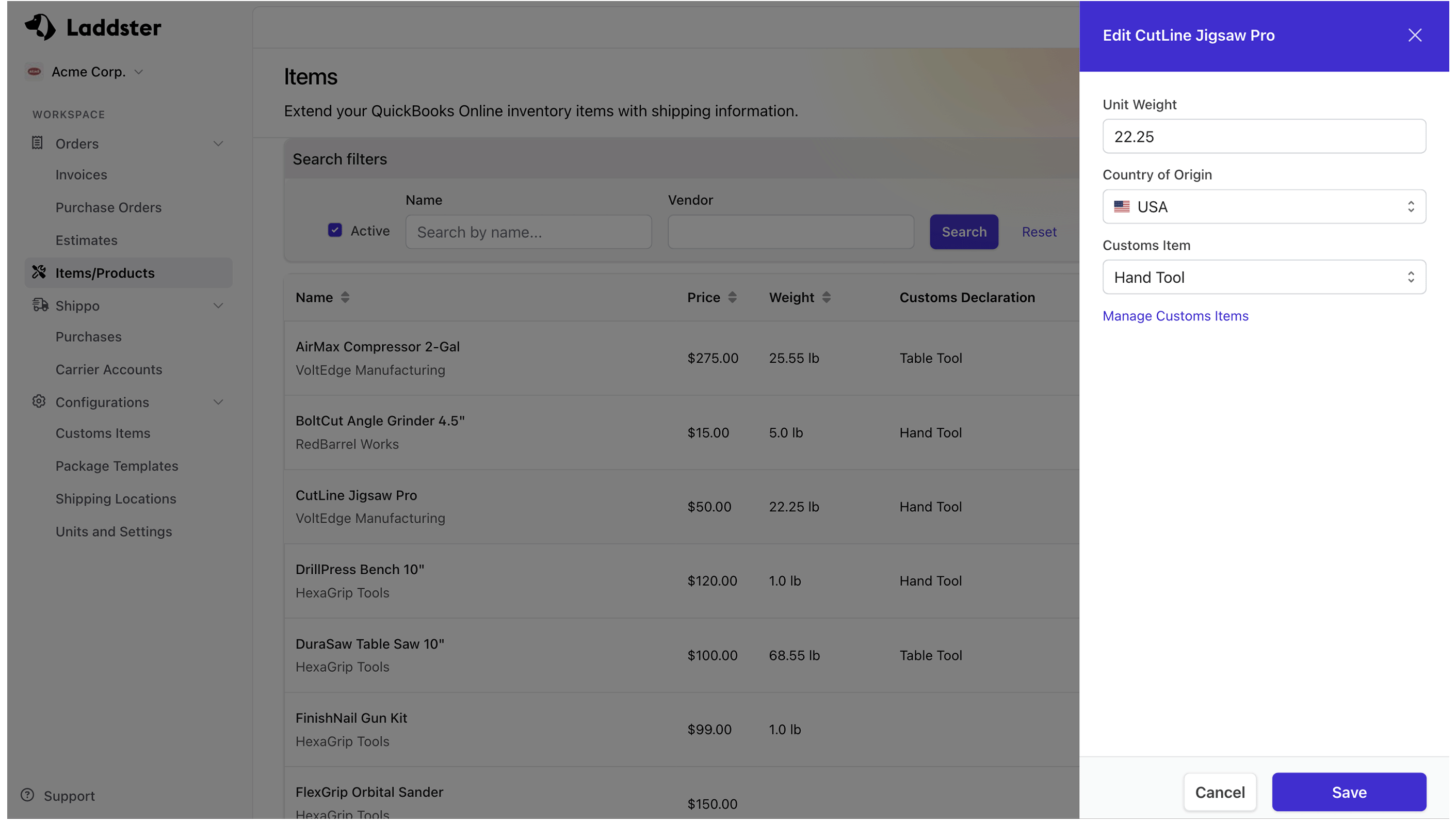 Items (also called Products) represent the goods you sell and ship. By extending your QuickBooks Items with shipping information, you can automatically calculate package weights and generate customs declarations.