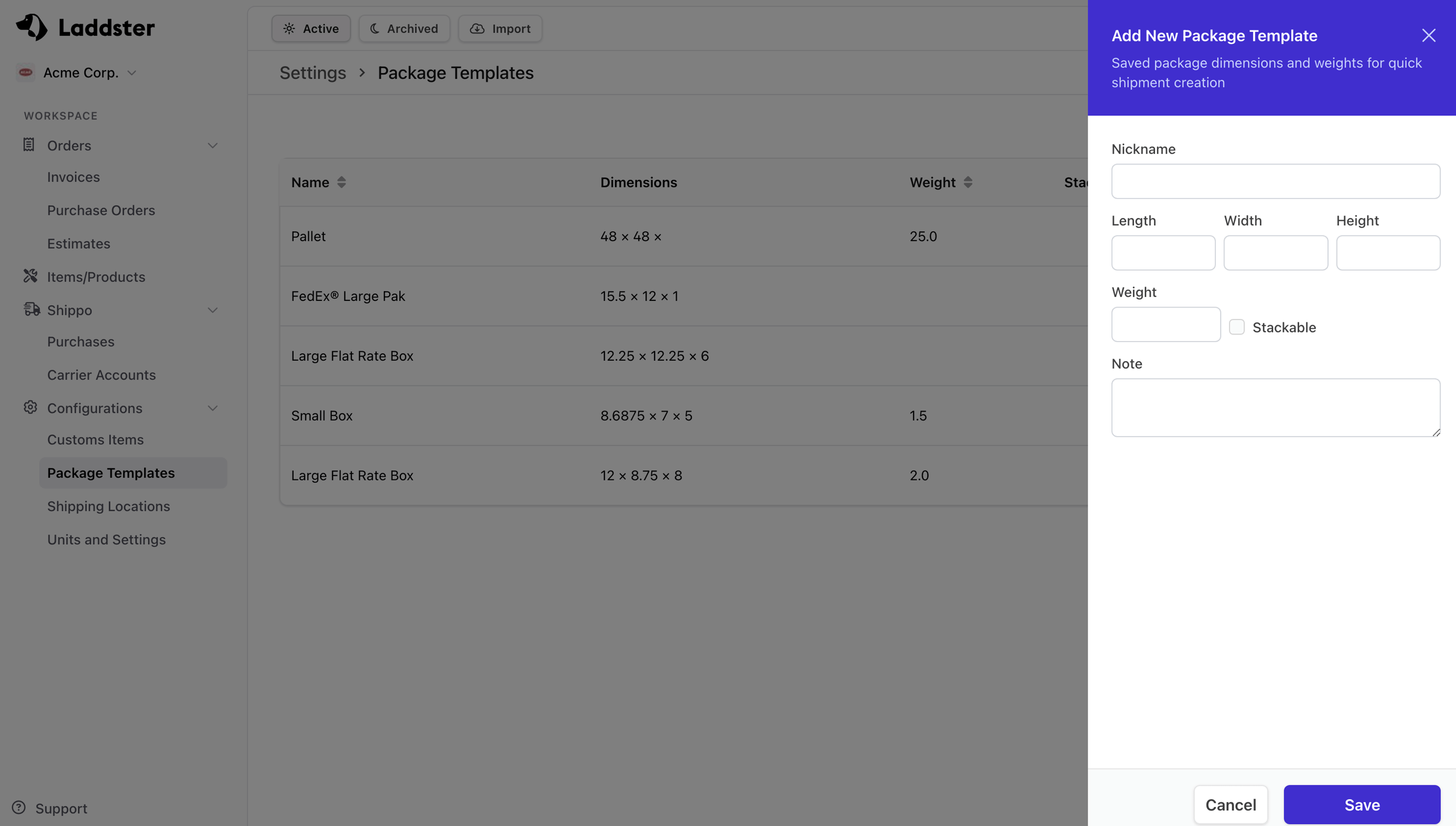 Create your own templates for packages you use regularly. Navigate to Settings → Package Templates and click "New Package Template".