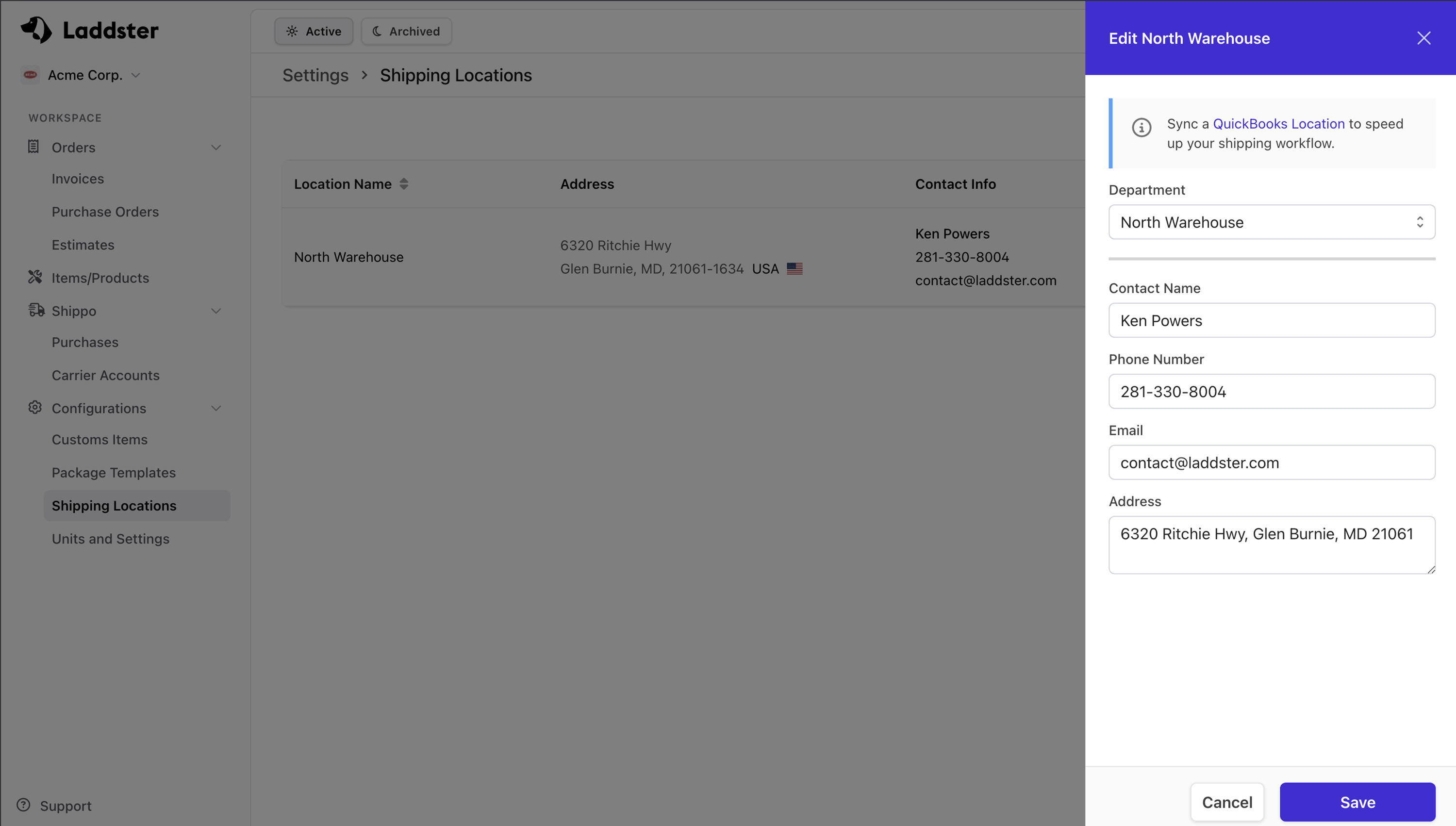 Shipping locations are the addresses you ship from (for invoices and estimates) or ship to (for purchase orders). Setting up your shipping locations streamlines your workflow and ensures accurate address information on labels.